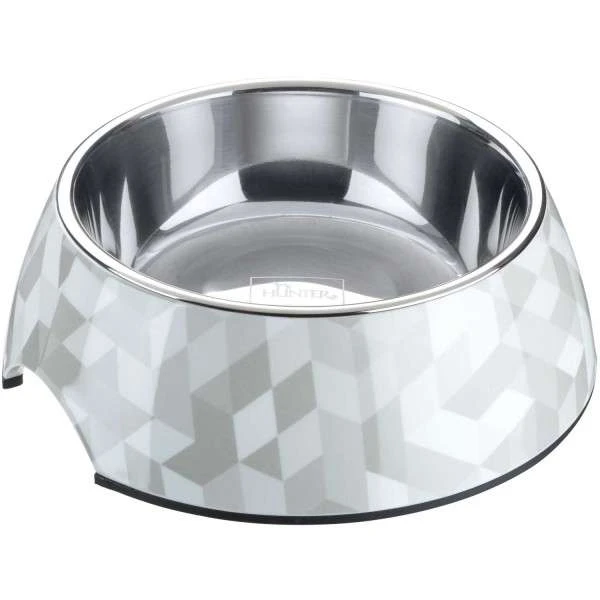Der Hunter Hunde- oder Katzennapf mit dem robustem Melamin Gehäuse. Der Edelstahlnapf ist herausnehmbar, einfach zu pflegen & hygienisch. Melamin ist ein Spezialkunststoff, der äußerst leicht und gleichzeitig kratz- und stoßfest, langlebig und temperaturunempfindlich ist. Seine nahezu porzellanartige Oberfläche macht es so besonders hygienisch. Melamin ist somit ideal für die Verwendung mit Lebensmitteln geeignet. Auf glatten Fliesenböden rutschen Futternäpfe oft weg, wenn der Hund frisst. Mit dem Melamin-Napf Mogami kommt das nicht vor. Damit der Napf gut steht und beim Fressen nicht wackelt oder sich gar verschieben lässt, hat er am Boden einen Gummiring, der für festen Stand sorgt.