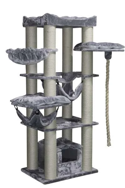 Kratzbäume dienen zur Beschäftigung Ihrer Katze und bieten oft auch einen Rückzugsort an. Somit schützen Sie Ihre Einrichtung, da Sie Ihrer Katze mit dem Kratzbaum eine gute Alternative zur Pflege ihrer Krallen bieten. Der Kratzbaum RUBI von NOBBY steht auf einer Grundfläche von 60 x 80 cm und ist 197 cm hoch. Die Kratzstämme bestehen aus Sisal und sind extra breit (Ø 15 cm) und damit besonders stabil. Der Kratzbaum ist mit einer offenen Höhle, zwei Hängematten, einem Hängekissen und vielen weiteren Liegeflächen ausgestattet. Außerdem ist er mit einem 1,20 m langem Seil ausgestattet, welches zusätzlich zum Spielen anregt.