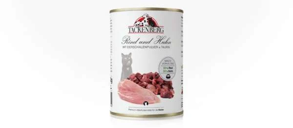 Tackenberg mit Rind, Huhn sowie mit Eierschalenpulver und Taurin ist ein spezielles Katzenfutter (Nassfutter / Alleinfuttermittel) mit viel Fleisch.
