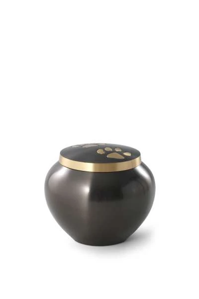 Diese hochwertige Metallurne ist metallisch dunkel gefärbt, wodurch die Oberfläche leicht schimmert. Verziert wird die Urne mit Pfoten-Spuren, welche das geliebte Haustier in Erinnerung rufen. Die Urne ist in verschiedenen Formen verfügbar.