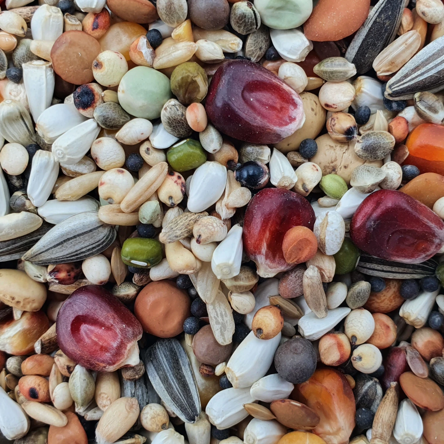 Cribbs Mais rot Nr. 76, Bordeaux Mais rot Nr. 200, Cribbs Mais gelb klein Nr. 198, Weizen hell, Gerste geschält, Milocorn rot, Dari weiß, Haferkerne, Rohreis, Kardysaat weiß, Sonnenblumenkerne gestreift, Leinsaat, Rübsen keimfähig, Rapssaat, Hanfsaat, Kanariensaat, Wicken, Katjang Idjoe (Mungbohnen), Sojabohnen getoastet, Dun Peas, Maple Peas, Erbsen grün klein, Linsen, Wildsamen, Mariendistelsamen, Sesamsaat